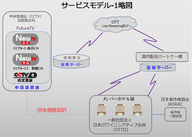 | ● 当社団の持つ海外ネットワークを通じて、海外放送局と直接、団体視聴契約を締結 します。 ● メンバーホテル様に供給されるのは、外国人宿泊客様の本国でリアルタイムに放送 されている24時間のライブ放送です。 ● これらの放送は完全に著作権が確立されているコンテンツです。安心してご利用い ただけます。 ● 団体契約によって、メンバーホテル様には、よりリーズナブルな料金(無償提供番組 を含む)で番組を提供します。 ● 配信は海外放送局および当社団と契約する国内パートナー(配信事業者)様の配信 インフラを通じて、メンバーホテル様に供給されます。 ● 海外局の国際放送サーバーとパートナー様の配信サーバーをインターネット経由で 直接接続致しますので高品質な画像が提供できます。 ● インターネット配信固有の著作権については日本著作権協会(JASRAC)を通じて 管理致します。 ● 提供する放送コンテンツは、中国中央電視台の国際放送部門から供給される 中国語放送3番組(NewTV総合、CCTV-4、NewTV新聞)です。 内容はTOPページを参照ください。 以降、メンバーホテル様のご要望に応じて各国語放送のリクルーティングを進めて いきます。 |